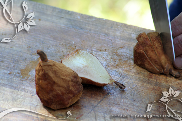 Peel pears, leaving the stalks on. Place in a large plastic bag with cinnamon and shake until all pears are thickly coated. Stand on a baking sheet and place in an oven at 200˚. Bake until the pears are tender enough to pierce easily with a skewer. Remove from oven and cool.