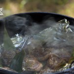 Dampen bark and tear into 5 or 6 pieces and place in the bottom of a large pot, wok or camp oven. Place a wire rack (cake rack) on top of bark. Place the duck breasts skin side down on the rack. Put the lid on the pot and place on a high flame. This will start to smoke fairly quickly. Give the breasts 10 minutes of smoking then remove. Leaving the duck to smoke too long can give the duck a bitter taste. Let the duck breasts stand.
